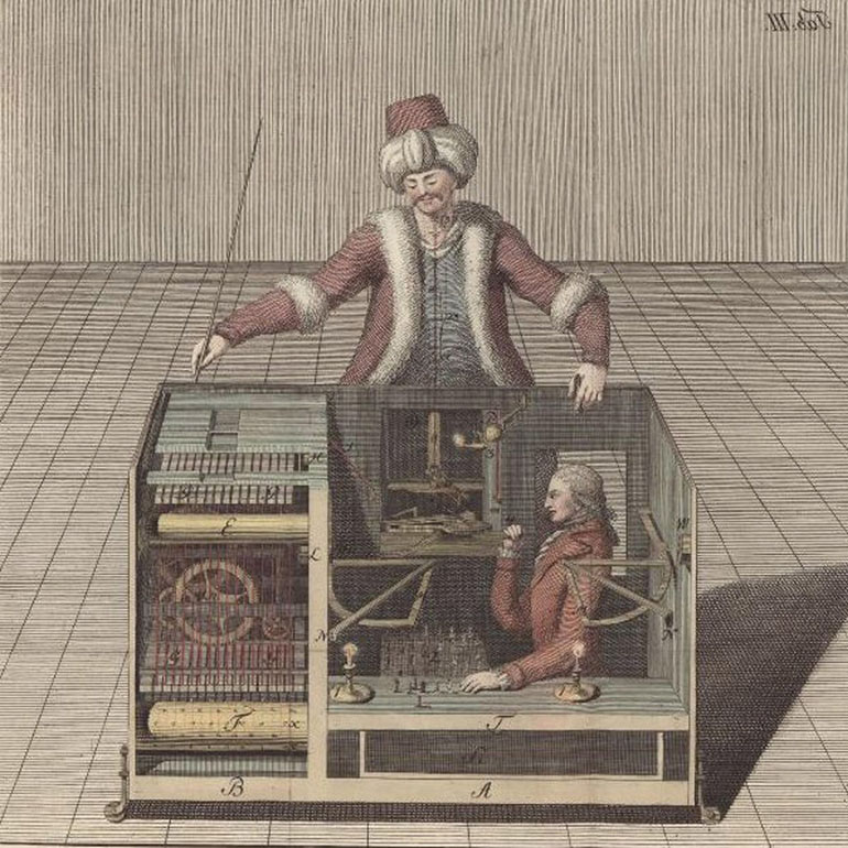 1784年には、ナポレオン・ボナパルトが、アメリカの興行ではベンジャミン・フランクリンが「トルコ人」と対戦しあえなく惨敗したという記録が残されています。実際にはチェスの名手が機械の下に隠れていただけのマジックだったのですが、だれもそのトリックを見破れませんでした [*2]。むしろ、人間以上に知能を持った機械の出現に驚愕したのです。