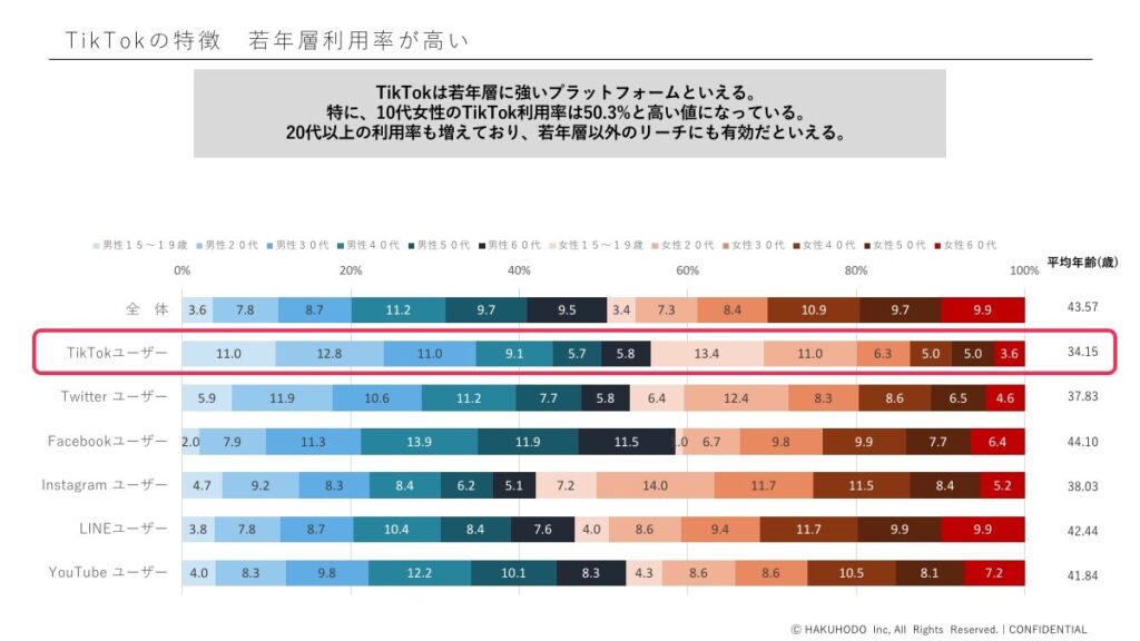 博報堂が発表した2022年版「コンテンツファン消費行動調査」を解説した記事では、日本のTikTokユーザーの平均は34歳と発表されています。