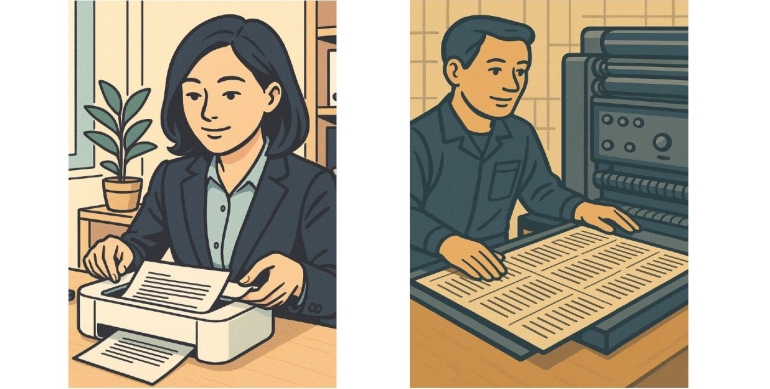 塗り足しは、印刷物の仕上がりを美しく保つために重要な工程です。印刷会社の印刷機は、家庭用プリンターのように「A4の画像ををA4サイズの紙に直接印刷する」わけではありません。業務用のオフセット印刷機では、大きな紙に複数の印刷データを付け合わせして印刷し、その後に複数枚の大きな紙を重ねた状態で裁断します。