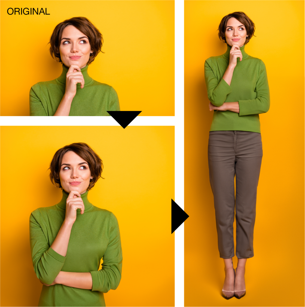 生成塗りつぶしによって拡張できるのは景色だけではありません。下記のように、この女性がどのようなポーズをしているのかをAIが考えて生成してくれます。深追いすると、全身まで生成してくれました。
