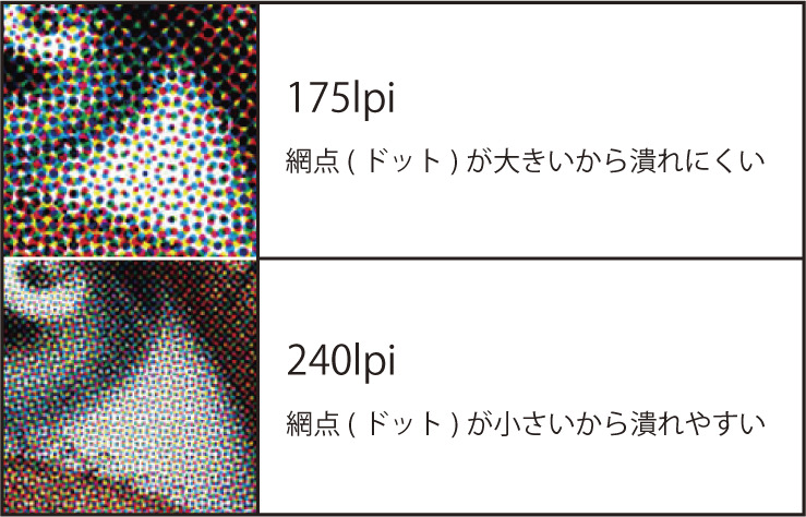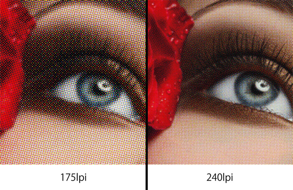 近年、デジタル映像分野で高精細表現が多数出ています。ハイビジョン、フルハイビジョン、4K、8Kなど、よりきめ細やかなデジタル表現が開発される中、アナログ分野であるオフセットカラー印刷では高精細印刷という表現方法があります。オフセット印刷ではデータを網点(あみてん)と呼ばれる小さな点のパターンに変換します。その点が1インチ(25.4mm)あたりに175個の網点で表現されるものを175lpiと言います。この数値は通常のカラー印刷でよく使われる数値です。 それ以上の線数、当社では240lpiで印刷することを高精細印刷と言います。