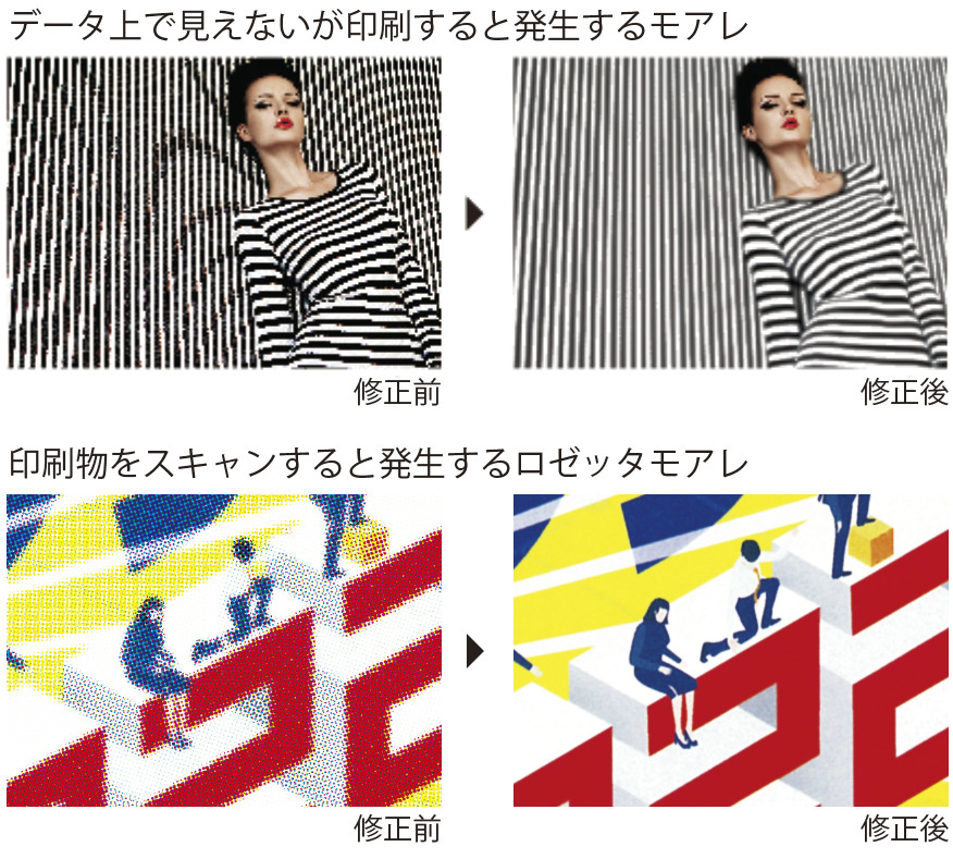 印刷物は基本CMYK4色の網点(ドット)がそれぞれ違う角度で構成されていて、色の濃さを網点の大小で表現しています。モアレは、規則正しく分布した線や点などが、印刷時に網点が重なり合うことにより発生し、データ上では見えない縞状の模様が現れます。